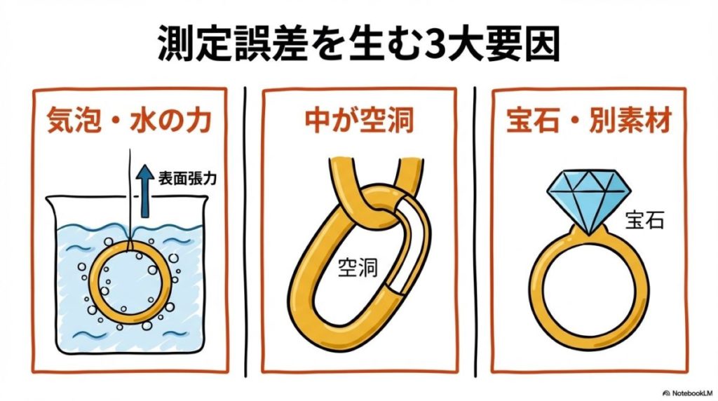- 「表面張力」「中空構造」「宝石」などが大きな誤差の原因になることを知る。
